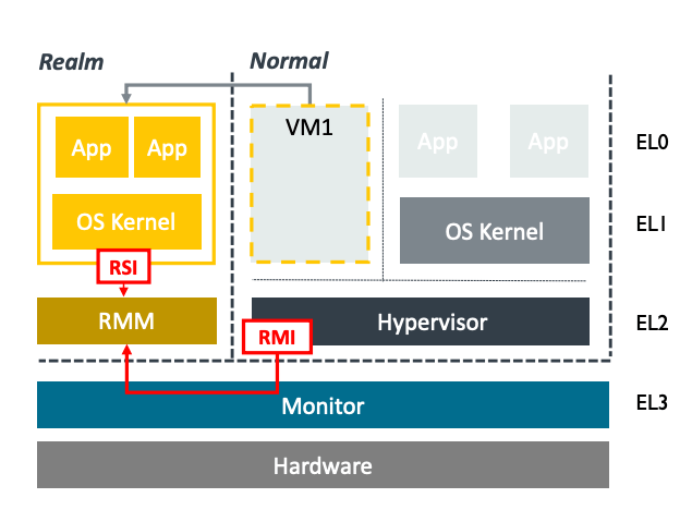 As part of the Arm CCA, a new firmware/software architecture is also defined. A new Realm Management Monitor (RMM) is defined which provides services for the hypervisor as well as to the realms themselves. This is done via a new Realm Management Interface (RMI).