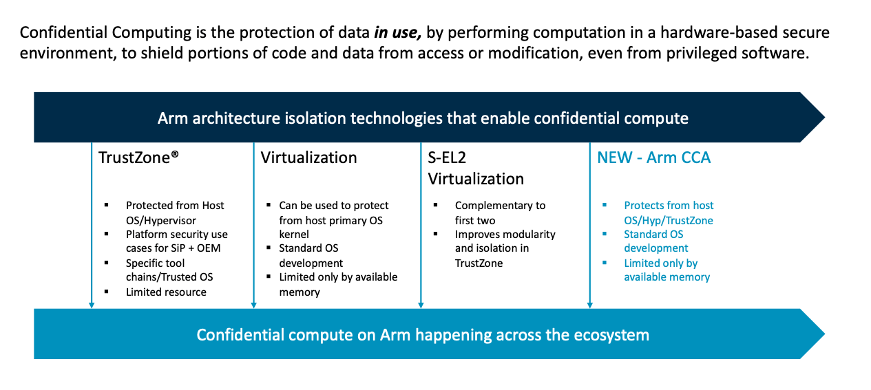 Arm's Confidential Compute Architecture (CCA) leverages the groundwork established by Arm's TrustZone technology. Under the CCA framework, it's specifically engineered to safeguard application data, even when it's actively utilized. This level of protection extends to shielding private data from unauthorized access, even by privileged software components like the hypervisor or the operating system.