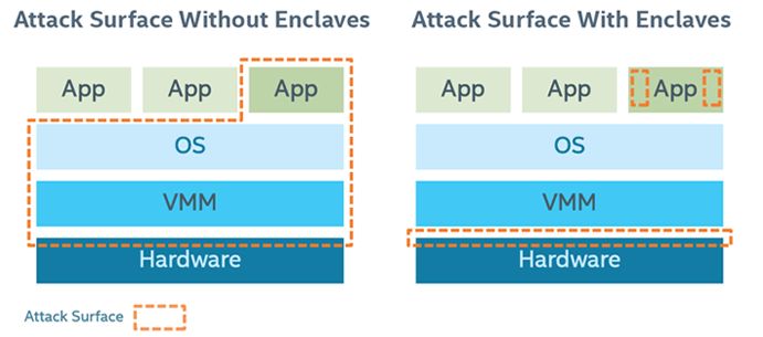 Traditionally, when a system’s BIOS, hypervisor, or operating system is compromised by a malicious attack, the attacker’s code can gain visibility and access to everything higher in the system stack, such as applications and data. Intel SGX utilizes memory encryption and hardware-enforced access controls to change how data is accessed, providing enclaves of protected memory in which to run applications and data.
