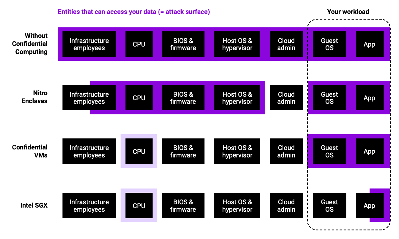 Figure 1: Simplified comparison of the trusted computing base (TCB) of the different confidential computing technologies. “Infra- structure employees” includes cloud provider and datacenter employees. For Intel SGX and CVMs, the CPU enforces the secure execution context. It is thus marked with lighter purple.