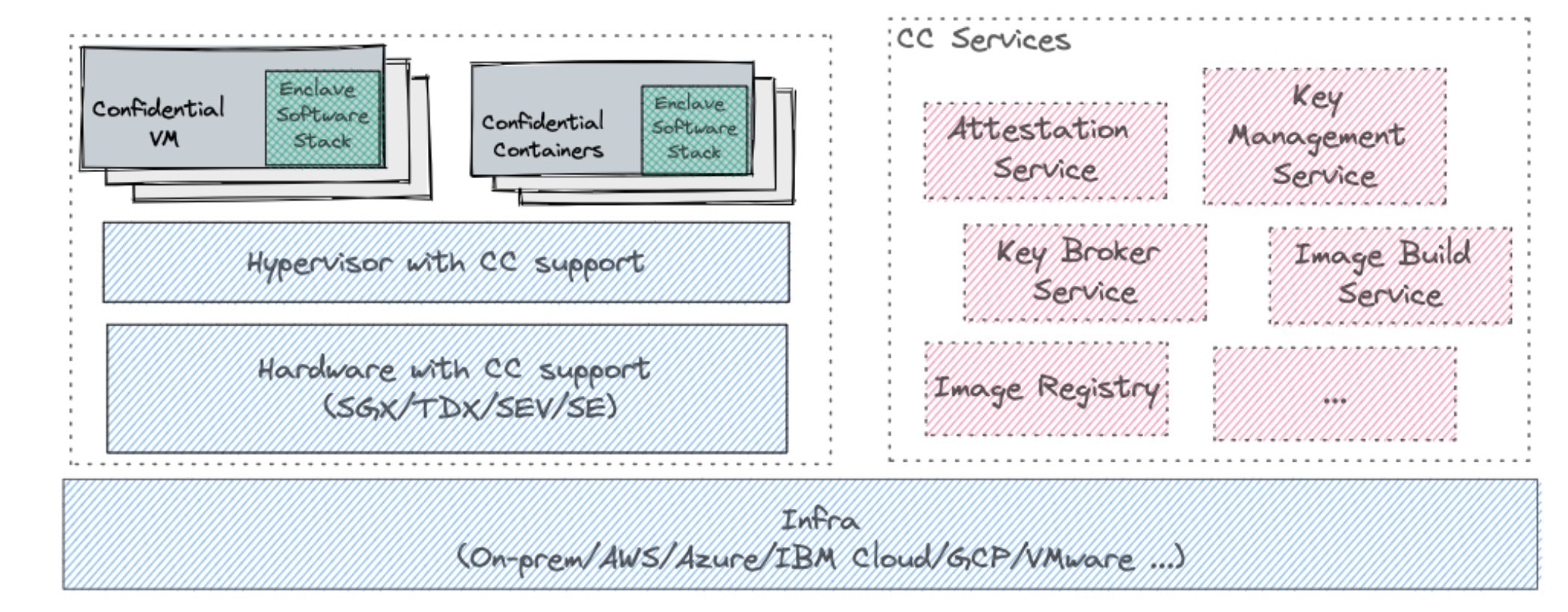 The following diagram shows how the different building blocks for Confidential Computing (CC) come together:
