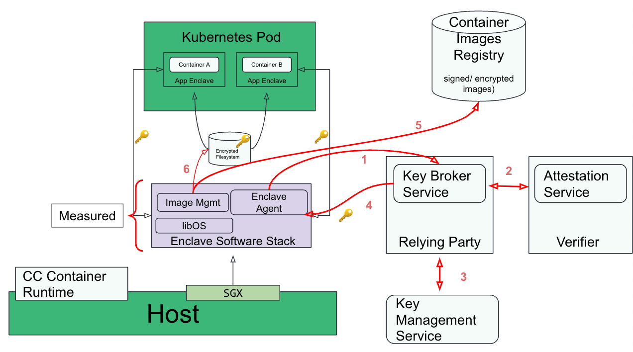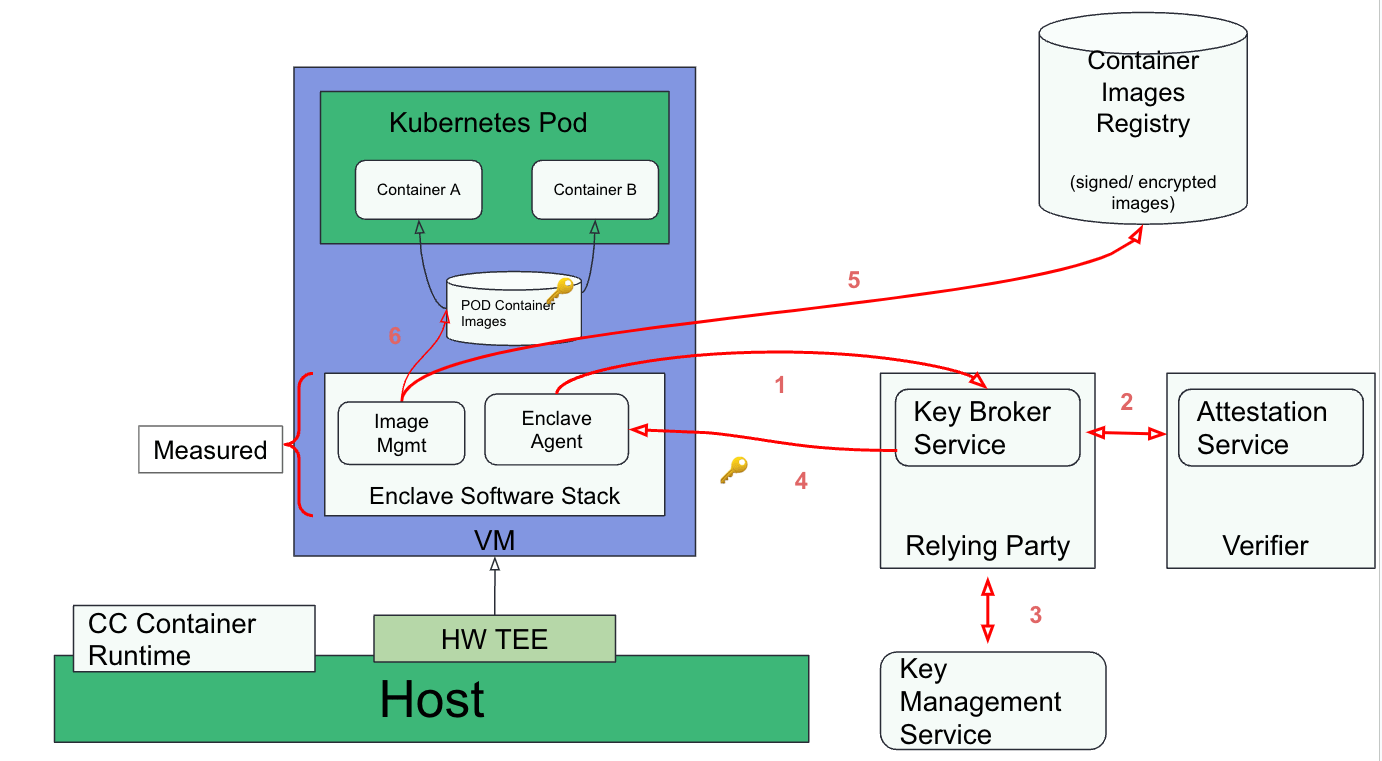 - Enclave (agent) gets the keys required to verify/decrypt the containers image(s): steps 3-4 in the diagram.