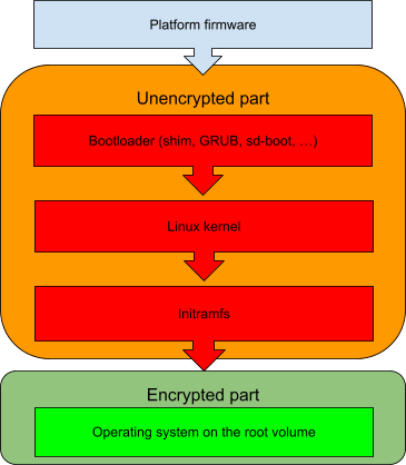 Opting for full disk encryption, rather than encrypting specific data volumes, appears to be an attractive approach. However, a key consideration arises: Is it feasible to encrypt every element comprehensively? Given that we cannot depend on the host to handle decryption on our behalf, it necessitates retaining some decryption code in an unencrypted form.