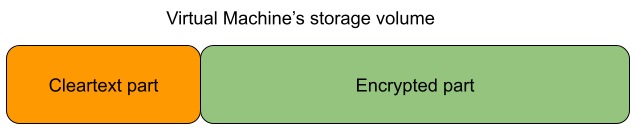 With confidential disk encryption, the root volume of a VM is pre-encrypted prior to the first boot on the target host. Some parts of the volume must remain unencrypted. In particular, all the code required to obtain the key to the encrypted part of the volume and perform the decryption must remain as cleartext.