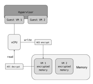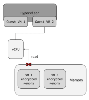 While the CPU is in the guest VM mode, it consistently encrypts the memory locations it writes to and decrypts them when reading. Each VM is allocated specific memory areas, ensuring that in the event of a hypervisor breach, one VM cannot access the memory of another VM; it can only access an encrypted version of it.