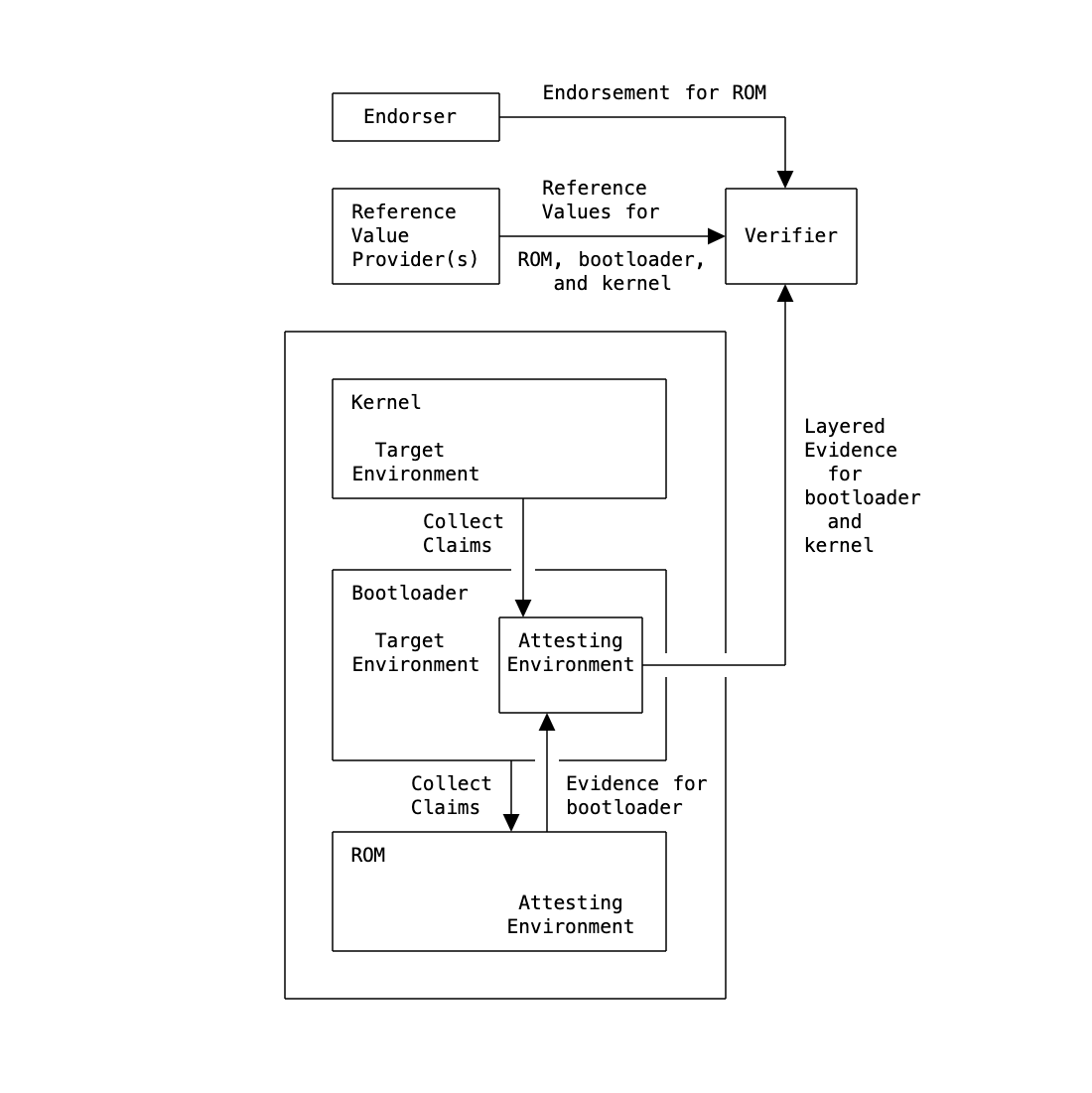 This example could be extended further by making the kernel become another Attesting Environment for an application as another Target Environment. This would result in a third set of Claims in the Evidence pertaining to that application.